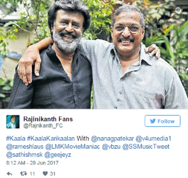फिल्म ‘काला’ के सेट की एक तस्वीर सोशल मीडिया पर वायरल हो गई है, जिसमें सुपरस्टार रजनीकांत और अभिनेता नाना पाटेकर की जुगलबंदी नजर आ रही है। इस तस्वीर में एक-दूसरे के गले में बाहें डाले रजनीकांत और नाना हंसते हुए नजर आ रहे हैं। अनुभवी अभिनेता नाना इस फिल्म में एक क्रूर, षड्यंत्रकारी राजनेता का किरदार निभा रहे हैं। आईएएनएस के एक सूत्र के मुताबिक, “इस फिल्म में नाना एक सख्त, क्रूर राजनीतिज्ञ का किरदार निभा रहे हैं। यह बहुत ही शक्तिशाली भूमिका है। इसमें दर्शकों को उनके और रजनी सर के बीच का प्यार और तकरार देखने को मिलेगी।” फिल्म में रजनीकांत नाना की राजनीतिक पार्टी का विरोध करते हैं और मुंबई में तमिल लोगों के बराबर अधिकारों की मांग करते दिखाई देंगे।